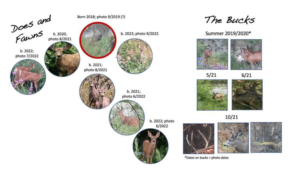 The photos below are the actual does and bucks who have so far spent time here or passed through. The bucks are pretty elusive. I was surprised I even had a some of the buck photos, and out of hundreds of pics, these are the only ones in which bucks appear. I can decipher the relationships between the does and fawns, but I’m clueless about the bucks’ ages or their relationships to each other or the does.
