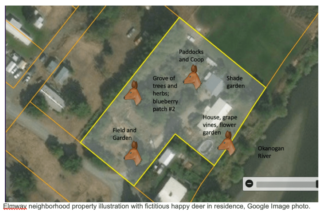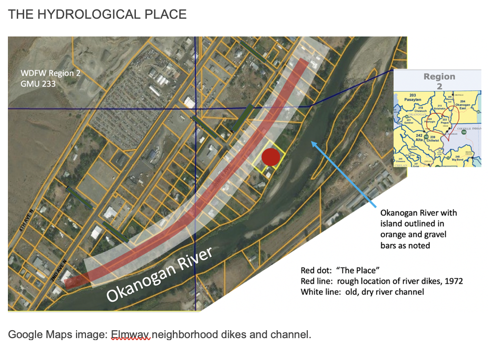 Zooming in on one of those prior Google Images, this is the Elmway neighborhood. The white swath is a dry river channel formed some time back when the river had a slightly different or larger flow. The red line marks a dike system put in place during the big 1972 flood. It might seem odd to have imprisoned the Elmway neighborhood on the flood side of the dikes, but most of the neighborhood is considered “indefensible” in emergency management terms because it saturates. Water comes up over the banks, yes, but also just percolates up out of the ground in that areas. Dikes can’t do anything to stop saturation out of the ground. They were intended to protect valuable business property and critical roads right outside the neighborhood. Army Corp built them and left them for property owners to maintain. Or not. The red dot is the spot I’m watching these deer on.