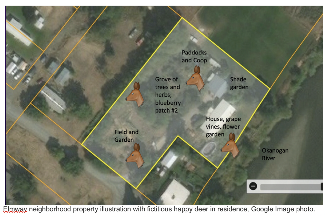 The Okanogan River is a fairly benign river when flooding in the spring, or at least it can be, and by benign, I mean only that it tends to flood “slowly.” We get a lot of forewarning in the spring and you can “see” the water coming at you from Canada for almost 48 hours before it arrives. Usually. But slow doesn’t mean gentle. In 2018, that slo-mo water rose over the banks, flowed into the old, dry channel, and saturated straight up through the ground all around us, eventually covering about 2/3 of the property on which I sit and that the deer eventually began using. The river is 115 miles long from its start in Canada to where it feeds into the Columbia River, to which it is a tributary. While I hustled trying to track and manage the flooding in a few block radius, there were deer along the a 250 mile swath of riverbank dealing with a 250 mile swath of unannounced, disrupted habitat. I wonder when and how they would have stepped back from it? Just far enough? Next “safe” spot?