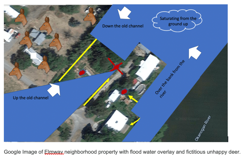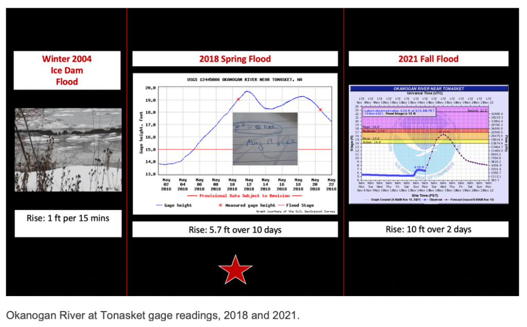 The river I sit on is fed by parts of those same flooded watersheds in Canada, and in fact, the Okanogan River in the U.S. is similarly sourced. In Canada, it’s the Okanagan River. Same river, just more A’s. The fall 2021 B.C. flooding pushed the water levels on the Okanogan in the US up to bank-full. Again, this was “out of the norm.” Normally, the river sits at 4 to 6 feet in height all fall and winter, but during this rare November flood, it flew from 6 feet to 16 feet in two days. Again, an impressive rise, but the Elmway neighborhood didn’t flood, and the water receded quickly because of the seasonal hydrology at play. The spring flood of 2018, however, was the real deal.