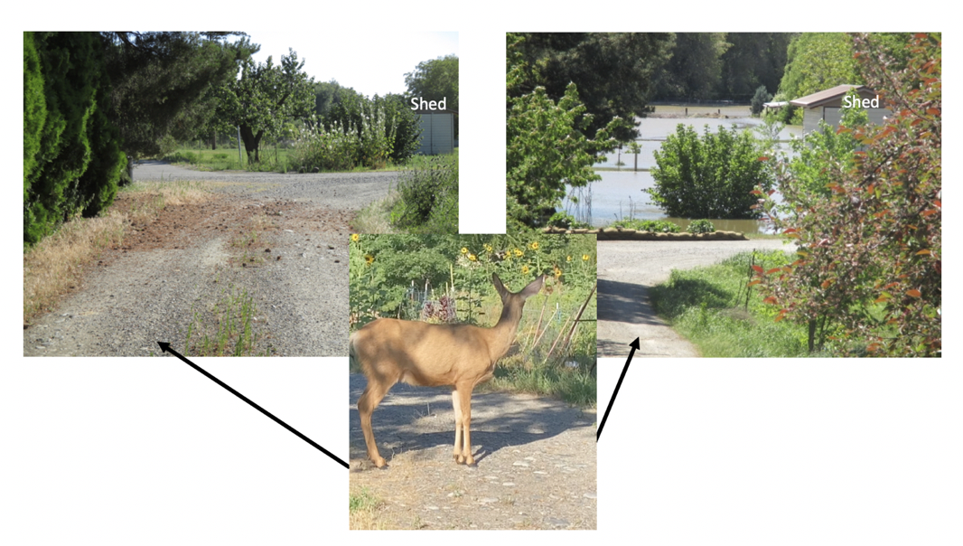 Left photo faces south down an old, dry channel during a “normal” year. The gravel is my drive. Right photo is the same spot from May 2018, during the flood. Channel was flooded for its whole length south inside the dike. Deer in photo 3 is standing in the same driveway, facing the channel, but in a non-flood year. The channel would’ve still been unusable into June, well into fawn season. The newborn that was brought here in 2022 walked up that channel to get here.