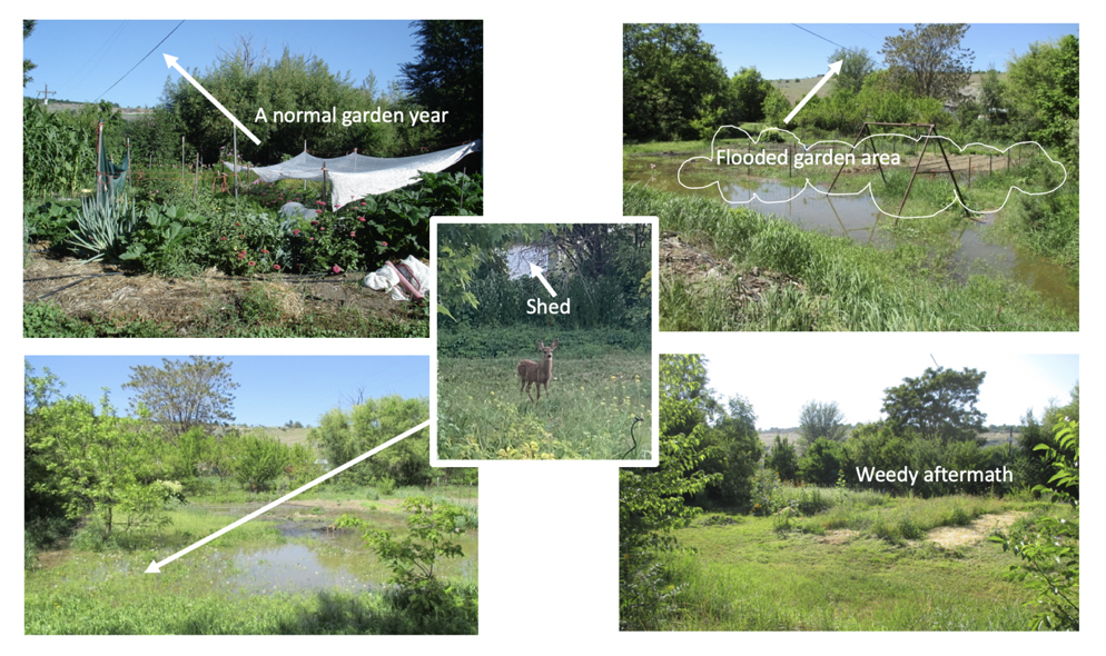 In the two top photos above of the field and garden area, an overhead wire helps mark the comparisons. The fawn in the center photo is standing in 2022 in what would have been the 2018 flooded area bottom left. The shed behind her is the same one in the previous driveway photos. There was no gardening that year, just a big influx of weed seed floating in and decades of buried pigweed and cochia seed floating up out of soil. The cheet grass drowned, which was nice, but it rebounded fully the next year.