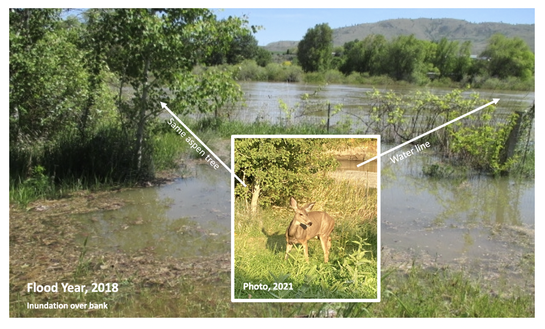The river’s rise from dormant spring levels to its crest lasted about three weeks, but much of the rest of the summer was also a wash. The spring water wasn’t a fast moving catastrophic rain storm like in 2021, but rather the full run off of snow melt from the watersheds in that feed the Okanogan River. And Canada had some snow packs up to 300% of normal that year. That’s a lot of water. After cresting, the river sat at flood stage for almost two weeks, and then ran twice as high as normal well into August. Many river corridors and much flora was impacted, septic systems and miscellaneous trash flowed into the river, wells were contaminated, structures and roads flooded, etc. Riverbank terrain these deer relied on were pretty unusable during spring/summer of 2018, but it wasn’t something I was tuned into then.