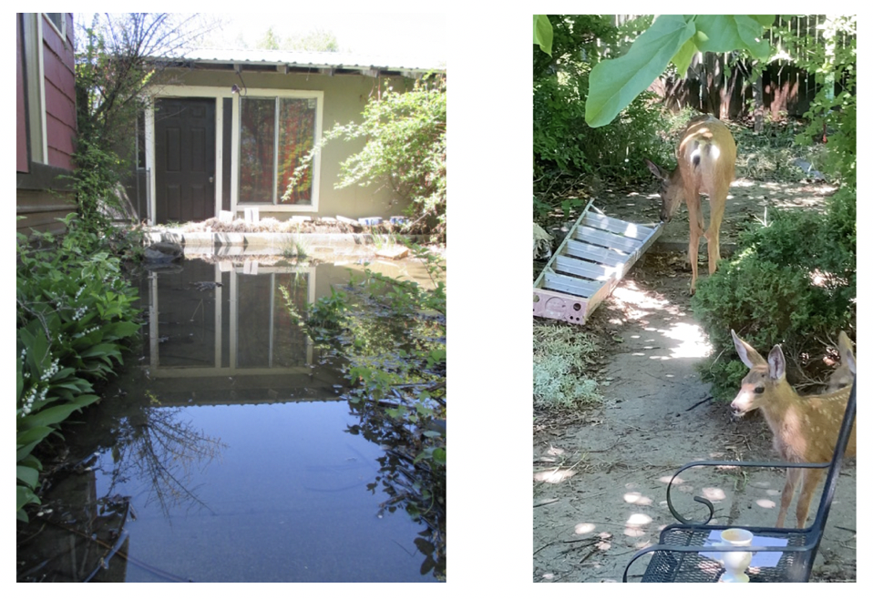 This 2018 water along the north side of the house is in a little patio area with multiple sidewalks in and out of it. Flooded sidewalk on left is where the fawn stands in the pic on the right (2022). The fawns love this spot. The little concrete paths lure them in. The area sits next to a main path the deer use to navigate the north line of the property and up and down the normally dry channel. Deer would have had no access safe access through the Elmway neighborhood in 2018.