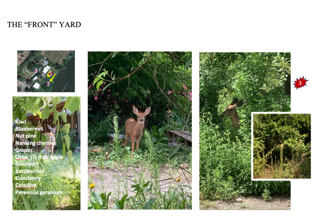 The last photo is the area outside of but directly next to the herb circle, which is quite open. It’s grassy, and there are two small ginko trees and an apple tree. Lots of laying around going on there at times. It’s adjacent to a blueberry planting, and it’s the spot where my son and I stumbled onto that rut in 2019 and where I stumbled on the little buck pictured above one day in 2021, again, a rare occurrence. In 2020, it was all eyes on covid, so who knows what was going on out there then.