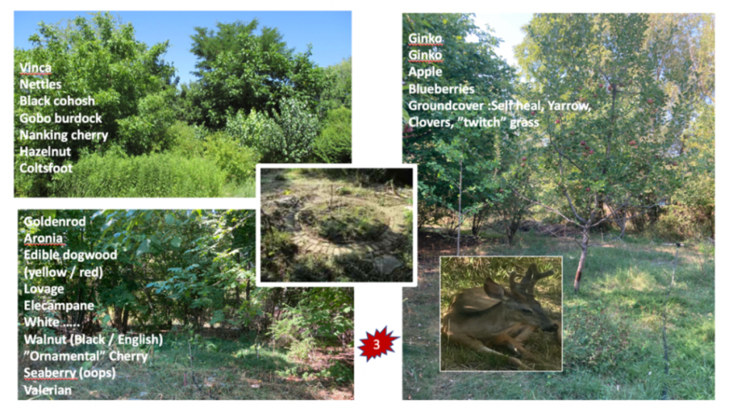 Below, the upper left photo is the area you encounter next, continuing toward the garden. It’s not a clump of mixed shrub and trees as it looks, but an open grove once you walk past the goldenrod and dogwood in the forefront of the photo. Lower left photo is the inside. There’s not much in there the deer munch on, but it’s large enough to serve as a more communal shelter spot. Does and fawns often holed up separately here, escaping heat or to rest or digest, but I saw does and fawns together in this spot regularly. It was originally an herb garden, and there are some great remnants left— noted on the pics— but the maturing trees here shaded much of it out. I like to weed it down every five years or so to see the original little walkways, center inset pic. It’s a nice place for humans to sit, too.