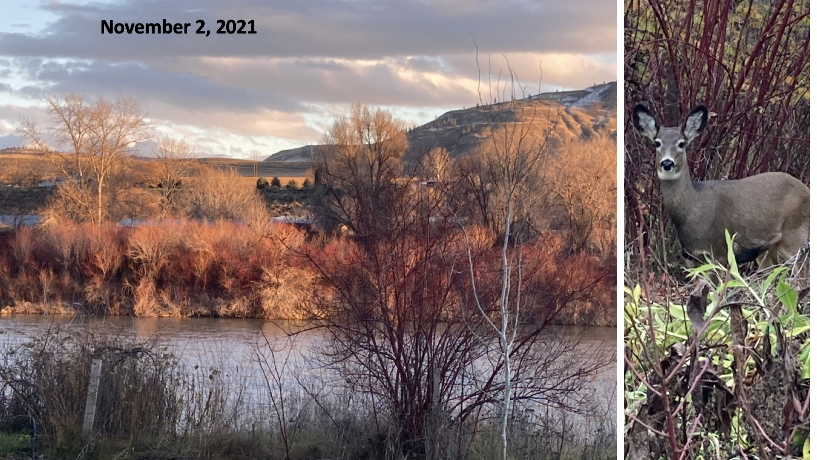 As winter comes, especially after snow falls, the deer from the Elmway neighborhood mostly disappear from my place but are regularly seen browsing landscape shrubs in town and I’d guess they’re hitting the orchards and any wheat or alfalfa fields they have access to south of Okanogan or up on the flats. But what about water during the frozen months? Deer can and do consume snow, but seems it would take quite a bit of work to consume enough snow to meet water needs. Harding’s previously noted article discusses how deer biology helps them conserve water during winter, for example, “drying” their feces prior to elimination, allowing the body to re-use that fluid. I know that deer sweat very little and mostly pant to dissipate heat, so not sweating would also conserve water. Harding also talks about changes in winter metabolism, i.e. lowering heart rates, energy use, digestion, etc. I’ve watched hens and roosters do this. They experience a state of deep torpor when sleeping in the winter cold, which is about as close to hibernation as an animal can get without fully hibernating. Their heart rates slow, breathing slows, energy use slows. During torpor, you can pick a rooster up and trim his spurs or treat a wound or dress him in a fancy little outfit if you want, and he won’t even notice.