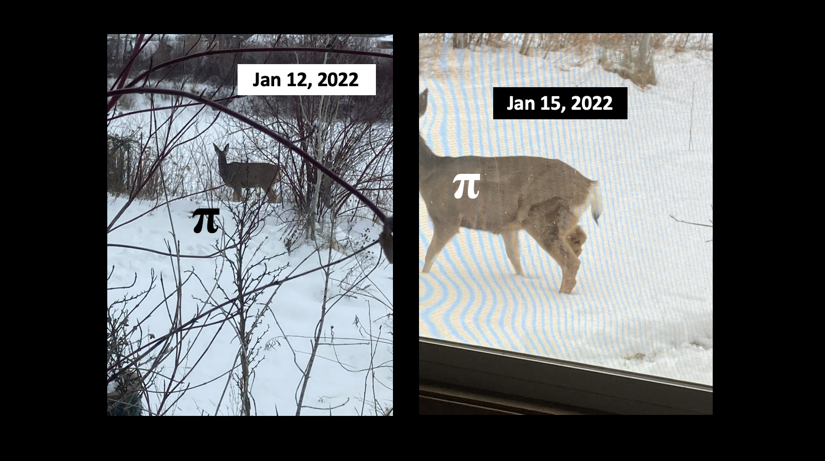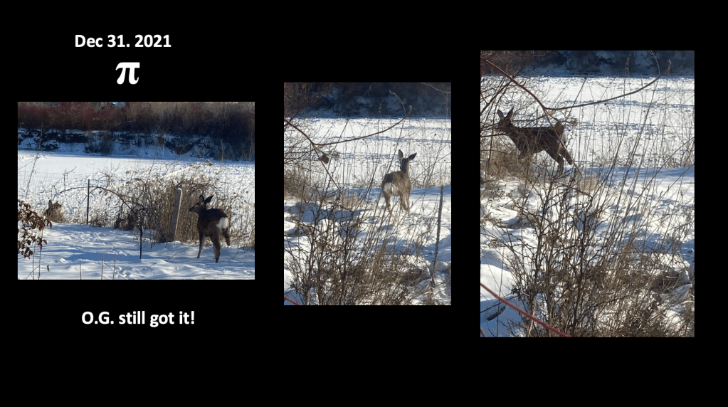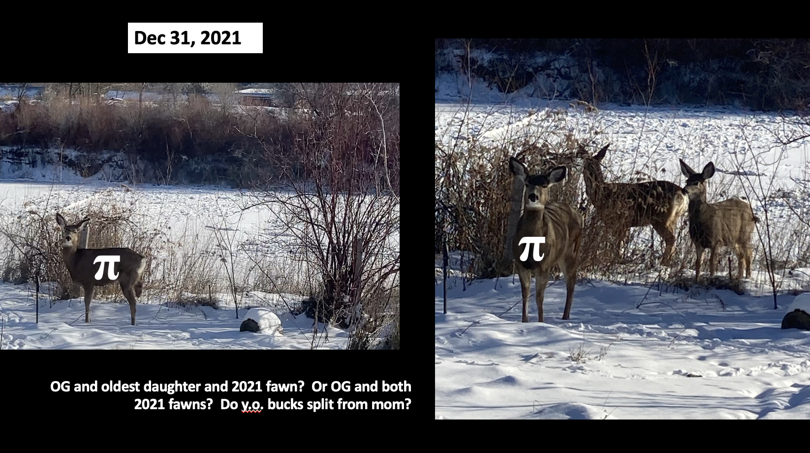 As the questions I forgot to remove from the photos above note, I think Pi is with her two fawns, but can’t definitively identify them. Where’s the Auntie? It’s clear who Pi is but those winter coats are otherwise deceiving.