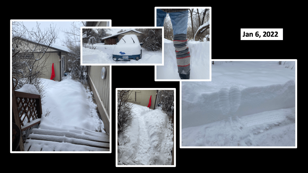 It’s not completely out of the ordinary to get some big snow dumps here though we also experience streaks of mostly mild winters, one of which was apparently ending. Just a couple weeks after the deep freeze, we got dumped on. Left photo above shows a deluged path leading to the patio area. Photo with the vehicle is near another well used path. This was snow that landed on top of a lesser base of snow, but a snow base that had also drifted. Drifts were definitely part of these pics, but a hundred miles south of the Elmway neighborhood, the town of Leavenworth got three feet over night on top of a 2 foot base. National Guard was sent to help. I wondered again about Pi. But as is common here on the river, once it snowed, the cloud cover warmed things up and there was at least some melt pretty quickly. Meantime, I was just cutting paths everywhere, and I wasn’t only one using them.
