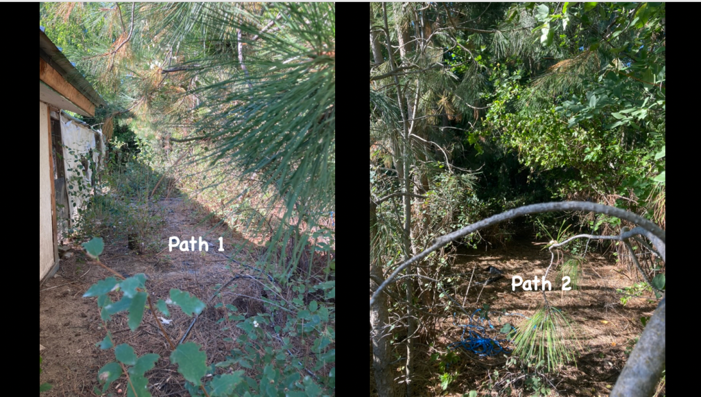 Once you pass the compost spot, there’s actually a double path. Photo way above, left, shows one path along the chicken run, and photo on right shows the second path next to it, which runs through a double row of predominantly conifers and snowberry. Both paths become overgrown about 30 feet onward, but if cleared up would lead to a shaded shelter at the corner of the property populated with willow, white mulberry, a Siberian Pea Shrub, and some other stuff. In addition to opening up a shaded “clearing,” it would connect the east-west and north-south paths and greatly improve any deer’s access to a pathway through this part of the neighborhood. And the conifers are nice. I’d use that path to get around the property, too.