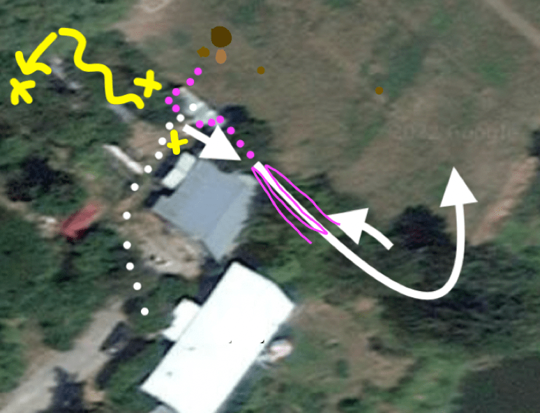 Pi was bringing in her fawns east from the paddocks toward the river bank, intending to go around a little snip of fence at the corner of the yard by the river and bed down on the bank or the edge of the neighbor’s field. The Auntie was bringing her fawns out of the backyard, west, to go bed in the paddocks. So, in the pic below, headed in the opposite directions along the big white arrows, they met in the purple scribbly spot. Except that I can’t see anything, I’m “watching” this from windows in the house that face the purple scratchy lines. In the pic below, the white dots are the path I took as the “incident” unfolded and the purple dots are the fawns’ eventual escape route (brown dots in field are them with Pi). The squiggling yellow arrow and x’s are a problem spot and an unanswered question about “the incident.”