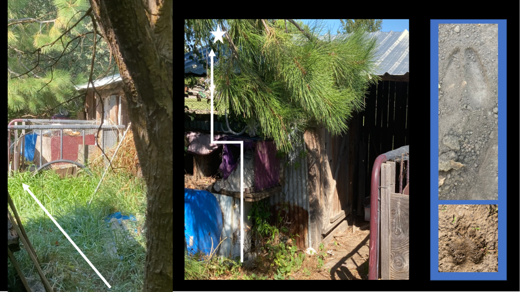 The fawns had jumped onto the pressure tank and needed multiple tries to get their footing onto the shed roof. The bottom of the tin roof in the pic is about five foot tall, the roof slope is short but pretty steep. The metal ruckus was them struggling with the roof and maybe even sliding back onto the pressure tank. As quick as the sound stopped, I’d bet they just finally flung themselves over the peak, jumping blindly into the field below. Their legs are still tiny, and I’d never looked at what the landing spot on the neighbor’s side is like, so, eek. But they’d jumped and they’d made it without injury (verified the next day). The white arrow in the middle photo above is the fawn’s mostly likely path up and over everything.