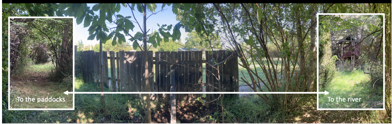 The first “incident” involves both the Auntie and Pi’s little families. Together at the same time, they were trying to navigate the north property line path, which runs east to west between the river bank and the paddocks. It’s plenty wide for a doe leading twin fawns, but a tight fit for six deer at the same time— especially at one particular spot.