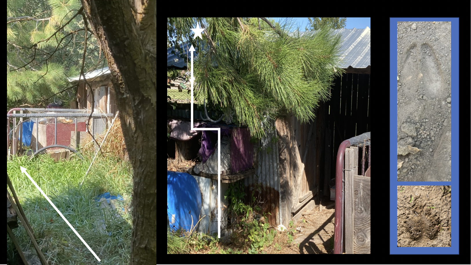 The photos above show the spot the fawns were in, except that it was dark. In the left-hand photo, the funny looking fenced spot is a compost set-up. Next to the compost pit is the area in the center photo. It’s the only metal and tin over there, a neat pile of annoying garbage: a 50 gallon pressure tank, a metal box, and a disintegrating set of old wood nesting boxes. They’re stacked under the overhang of the tin roof of the “trash and recycle shed” pictured. The property line fence runs directly behind both the shed and the compost area, with no openings.