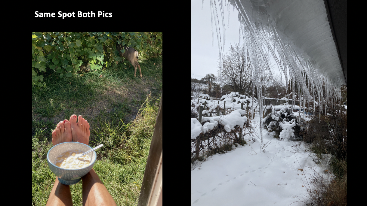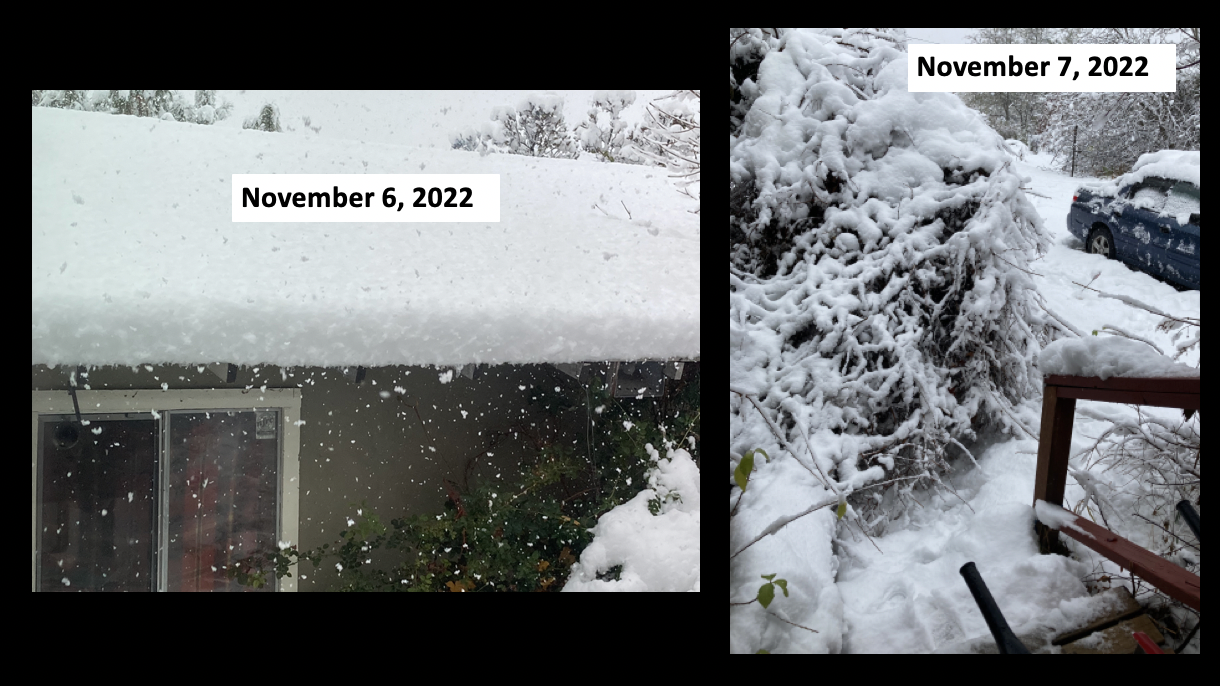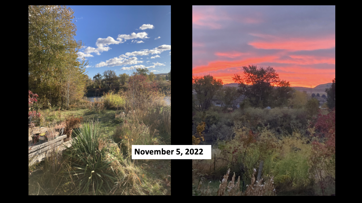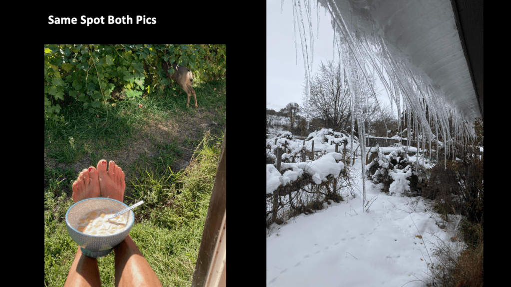 It’s hard to believe this happened, but it did. Beautiful weather continued into early November, as the Nov 5 pics above show. But by lunch time on the 6th, whole new world.