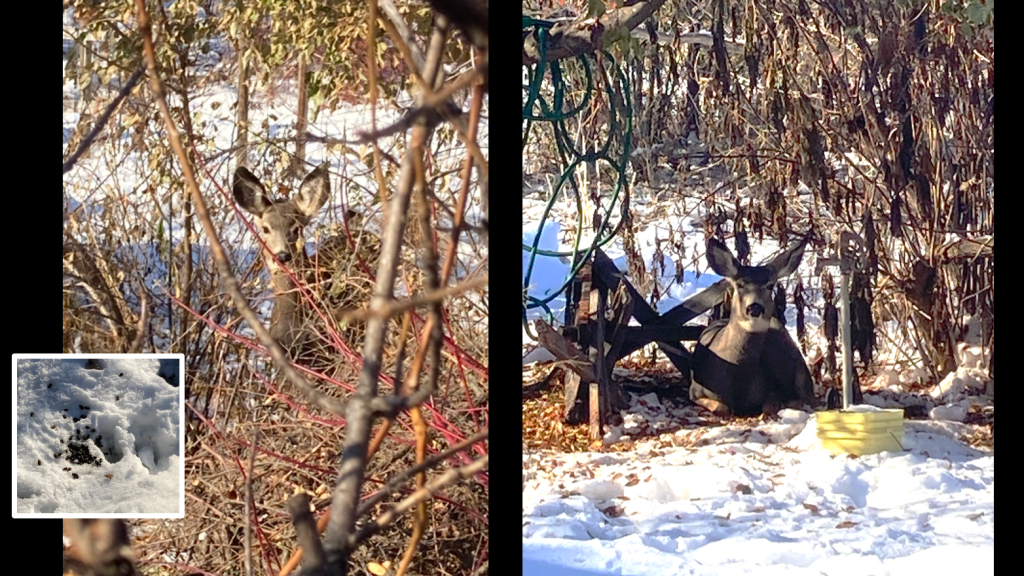 Late morning Nov 18, the doe and fawn were resting under an ornamental crab apple tree whose branches had blocked some snow and where the day’s sun had “warmed” up the ground. The prior day, following their tracks around a bit, I’d noticed some orange-red spotting in the snow in places. It was the crab apples still falling off the tree, mushy though they are. Whether deer are eating them or not, they’re tracking them around. (Birds and squirrels are definitely eating them.)