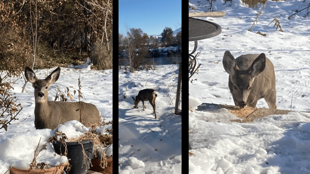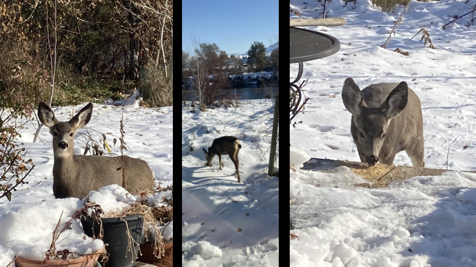 Finally! On Nov 17, 2022, I startled a doe and a fawn I didn’t know had walked into the paddocks behind me without my noticing. So I guess they also startled me, too. I turned around to head back to the house and there they were. Yeah! Deer life! I stayed mostly out of that part of the property for the rest of the day so they’d feel “comfortable” and hopefully stick around a bit, but I walked other areas of the property, following tracks and finding some healthy little snow poops. Woot.