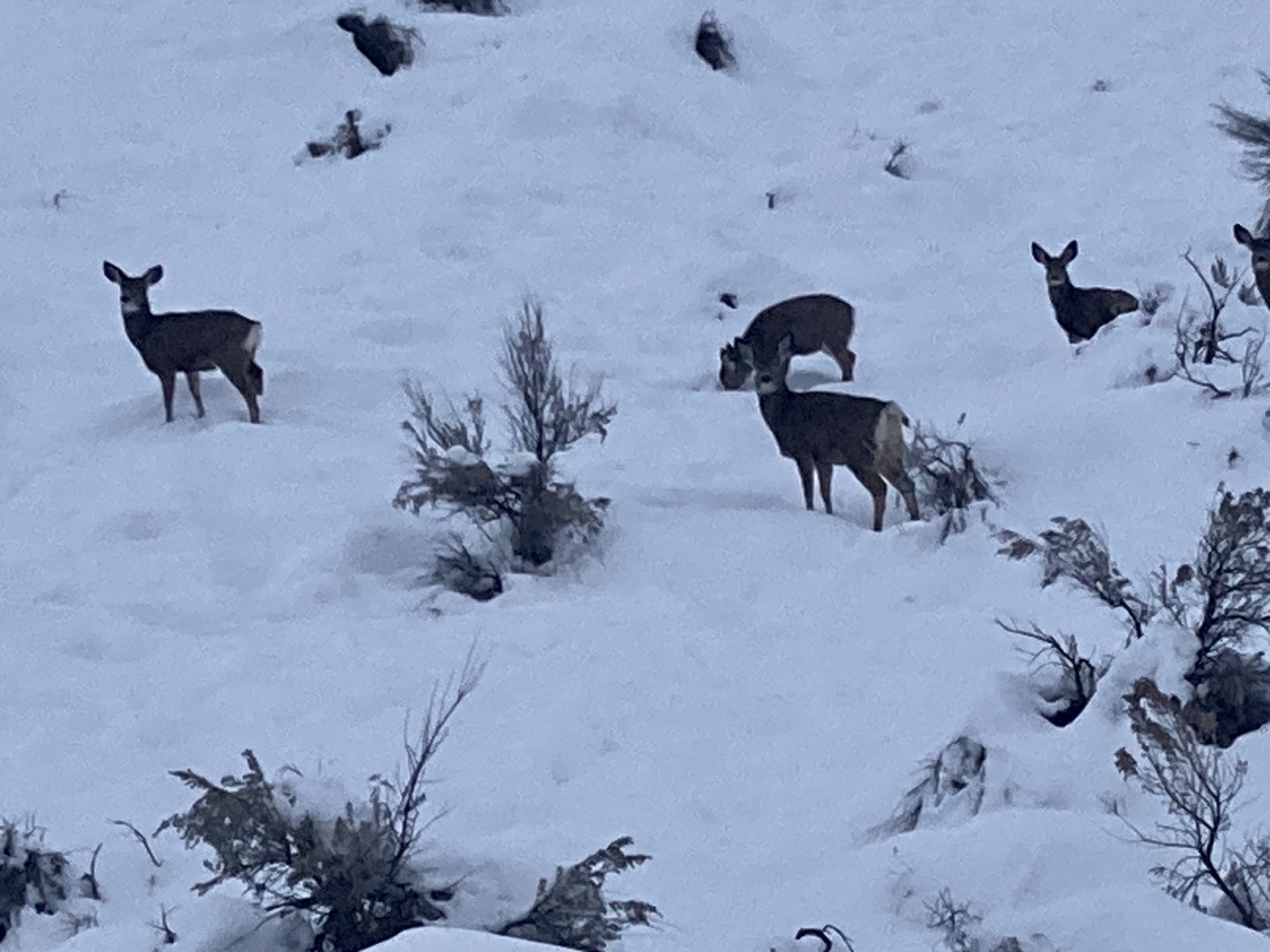 My friend Jean spotted a three legged doe (far left, above) on a hillside in the residential area of Okanogan again during the first week of December. The deer’s leg injury is pretty much identical to Pi’s injury, and she’s known to frequent that area sometimes, so odds are high it’s her. We continued to get pretty smashed by snow through the end of November and through December: first 20 inches, then 15 inches, then 10 more inches. A lot of the deer browse (food) on my property is bent over, broken, frozen to the ground and covered in snow, so I’d begun to hope they were finding sun facing hillsides that had some snow melt. Looks like that’s possible, though that last ten inches of snow fell after the above photo was taken.