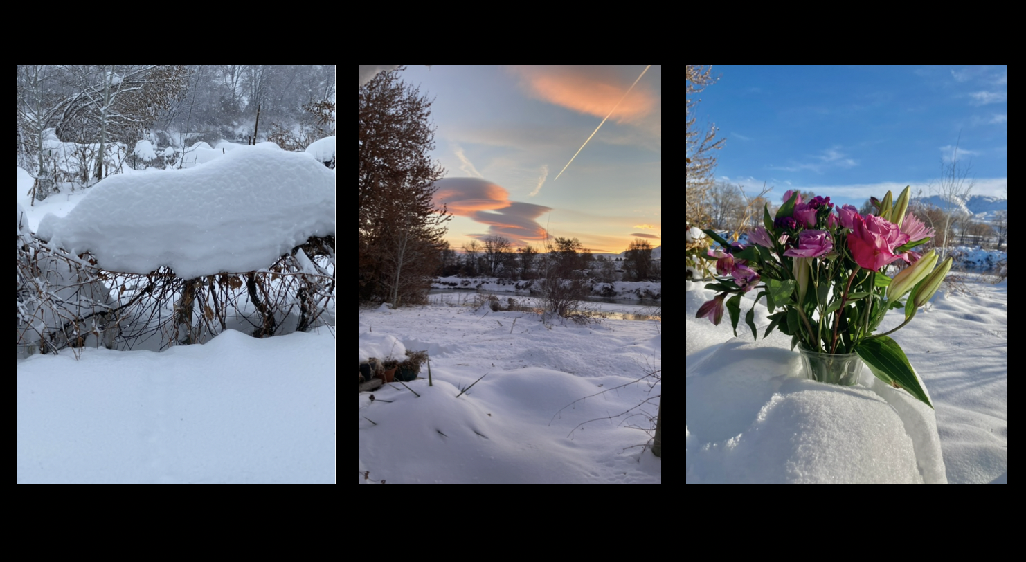 Left: Backyard grapevines showing layers of our snow storms. Center: Backyard and view of the river with orange space ships, lower left corner of pic is a trounced yucca plant. Right: A bouquet of flowers dropped off on surprise by a friend. It’s sitting on the back deck table.