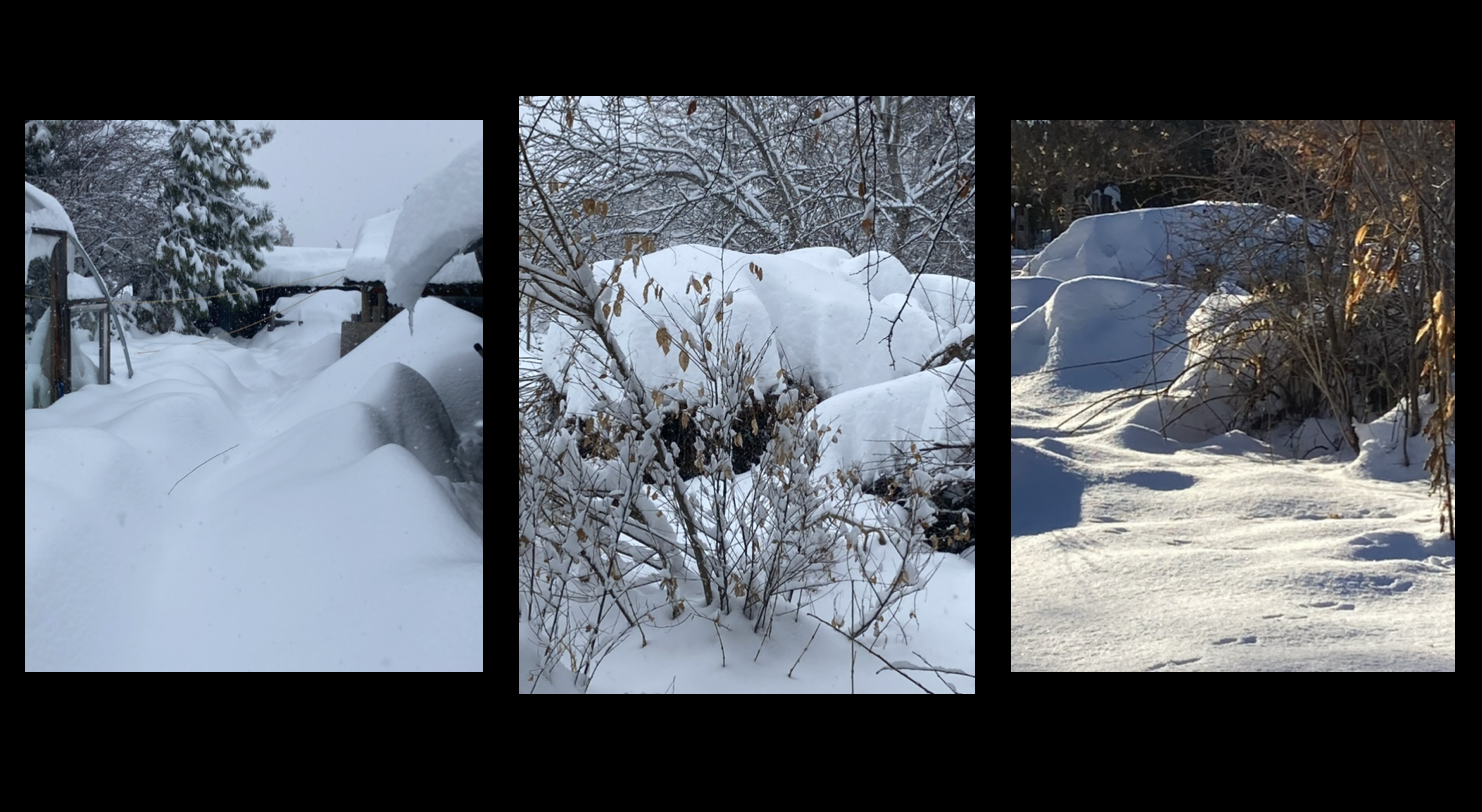 Left: This is the spot the little fawn tried out his/her first foot stomp in one of the videos in the OG Returns post. Center: Places the deer used as shelter are masses of snow right now. Right: Those lumps are 8 foot forsythia, now barely three feet tall in their snowsuits. There will be damage on this property from these big snow dumps. Broken branches on trees and shrubs are entry points for disease, and things are probably going to require a lot of pruning in the spring to stay healthy. The blueberries are particularly at risk because their little branches are so delicate, and they’re almost entirely buried in both plantings. I tripped in snow over my knees and fell on one while trying to clear the roof of a small greenhouse. I have no idea the extent to which the habitat here will be damaged come spring, but it will also be well watered.